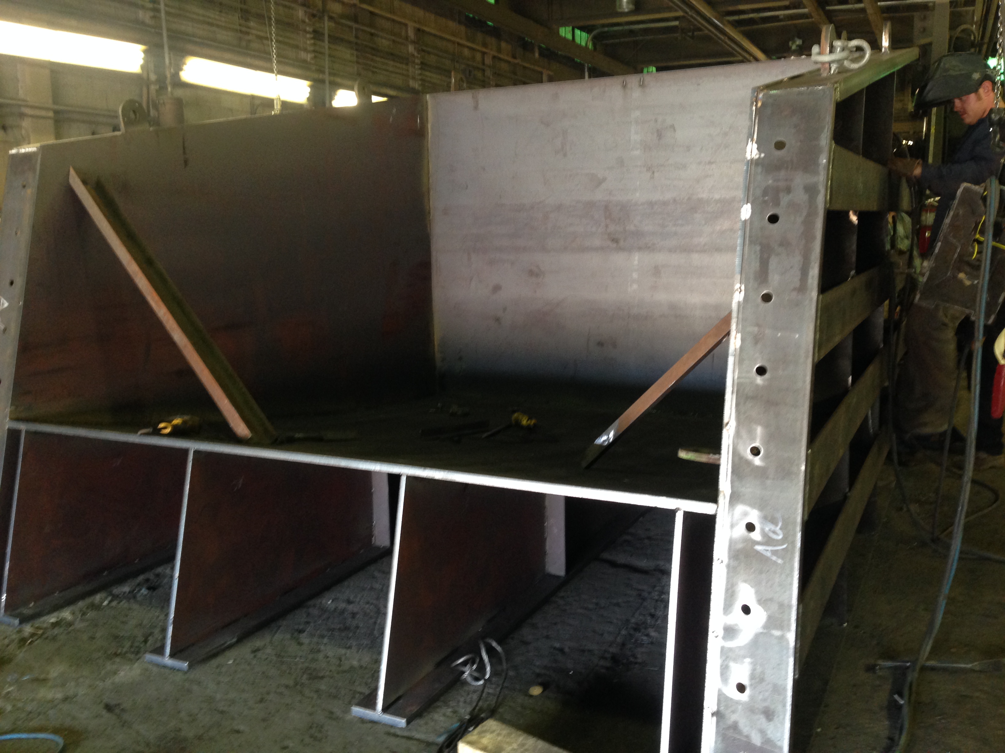 Sometimes what an item is used for is more interesting than the item itself. In this project we were contracted to build a full scale model of a section of a large melting furnace. The mock-up furnace section was to be for a simulation of an upcoming furnace demolition. The premise behind the box was to test the feasibility of using explosives in the demolition process. This mock up was to test different charges and placement. Also to monitor the integrity of the hearth floor steel. The box was used to the point of destruction on two separate tests. After the first test the floor steel buckled. The box was brought back to us and the warped section of the floor was replaced. After the second destructive test the box was unrepairable.